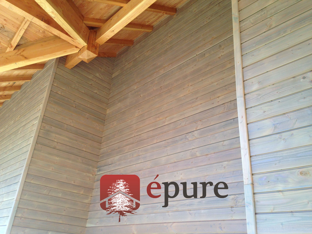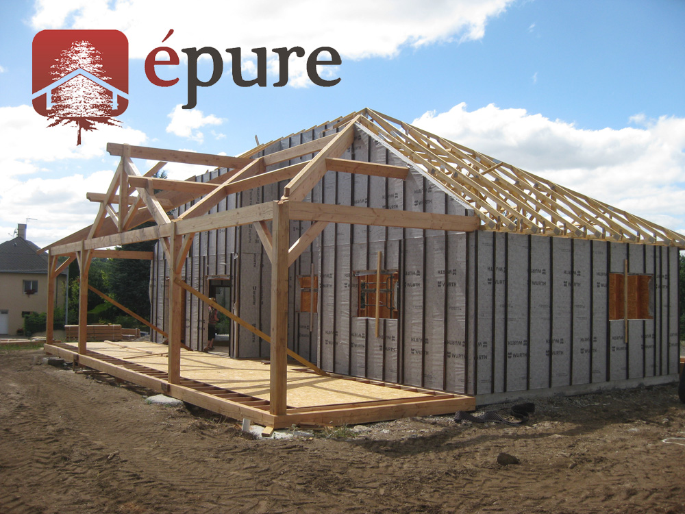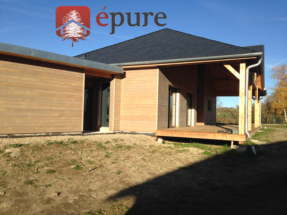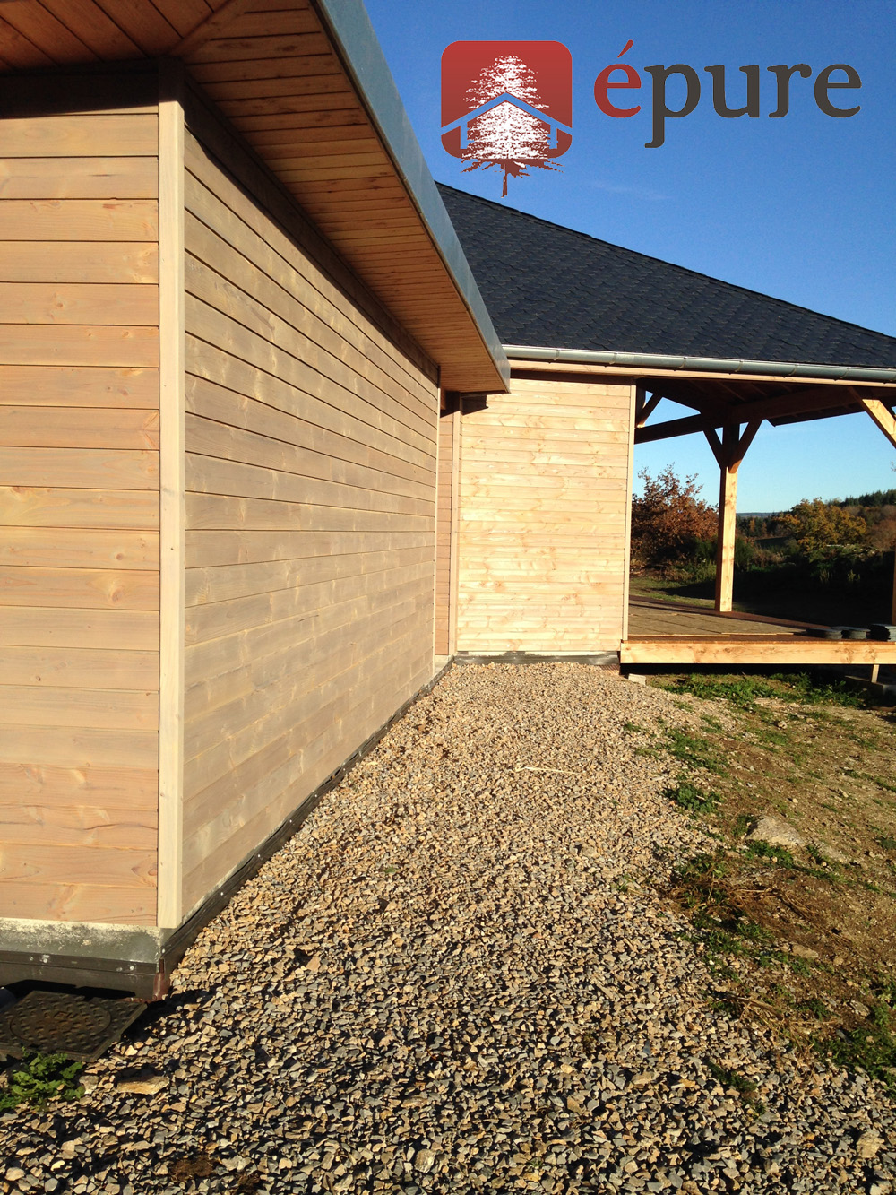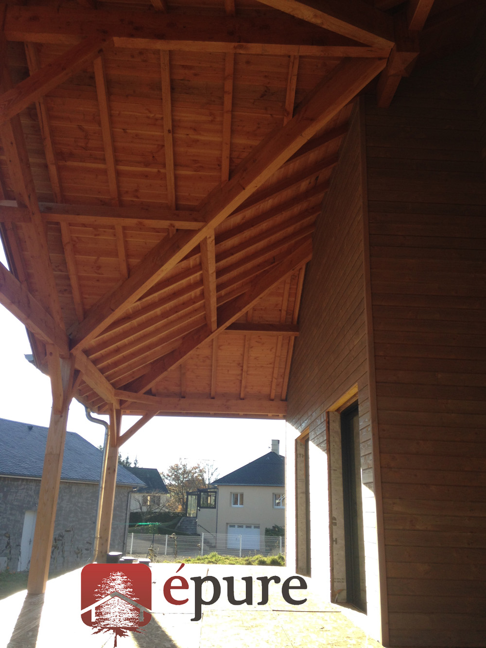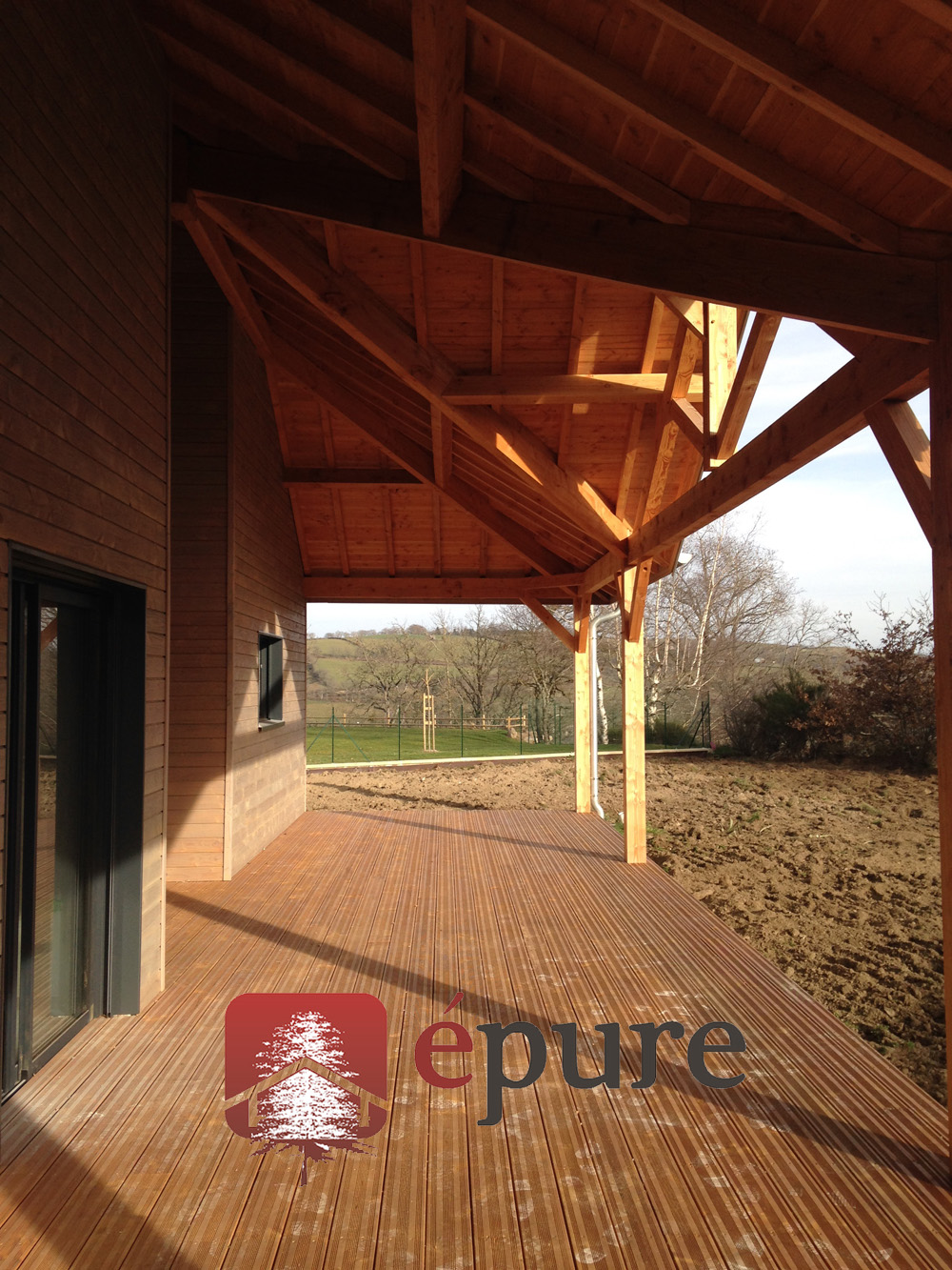 - composition de la structure:murs ossature bois douglas, bardage douglas saturé gris vieux bois, charpente traditionnelle sur terrasse en douglas, charpente habitation en fermettes industrielles